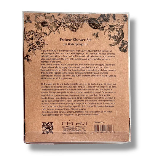 Celavi Deluxe Shower 3Pc Gift Set: Body Sponge, Back Scrub, and Exfoliating Mitt