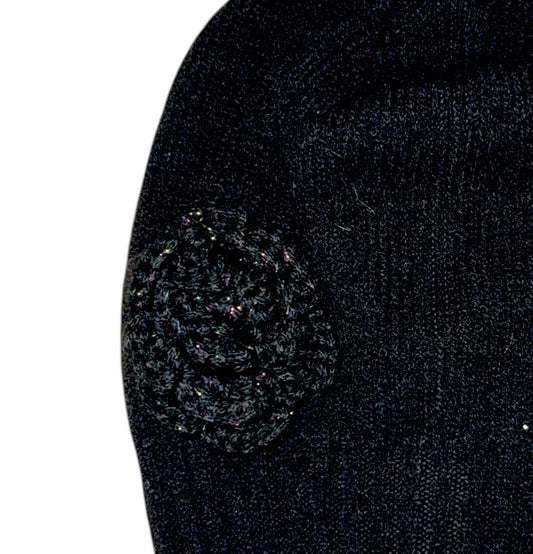 Toddler Girls Beanie Shimmery Black Knit Winter Hat with Flower Accent, One Size