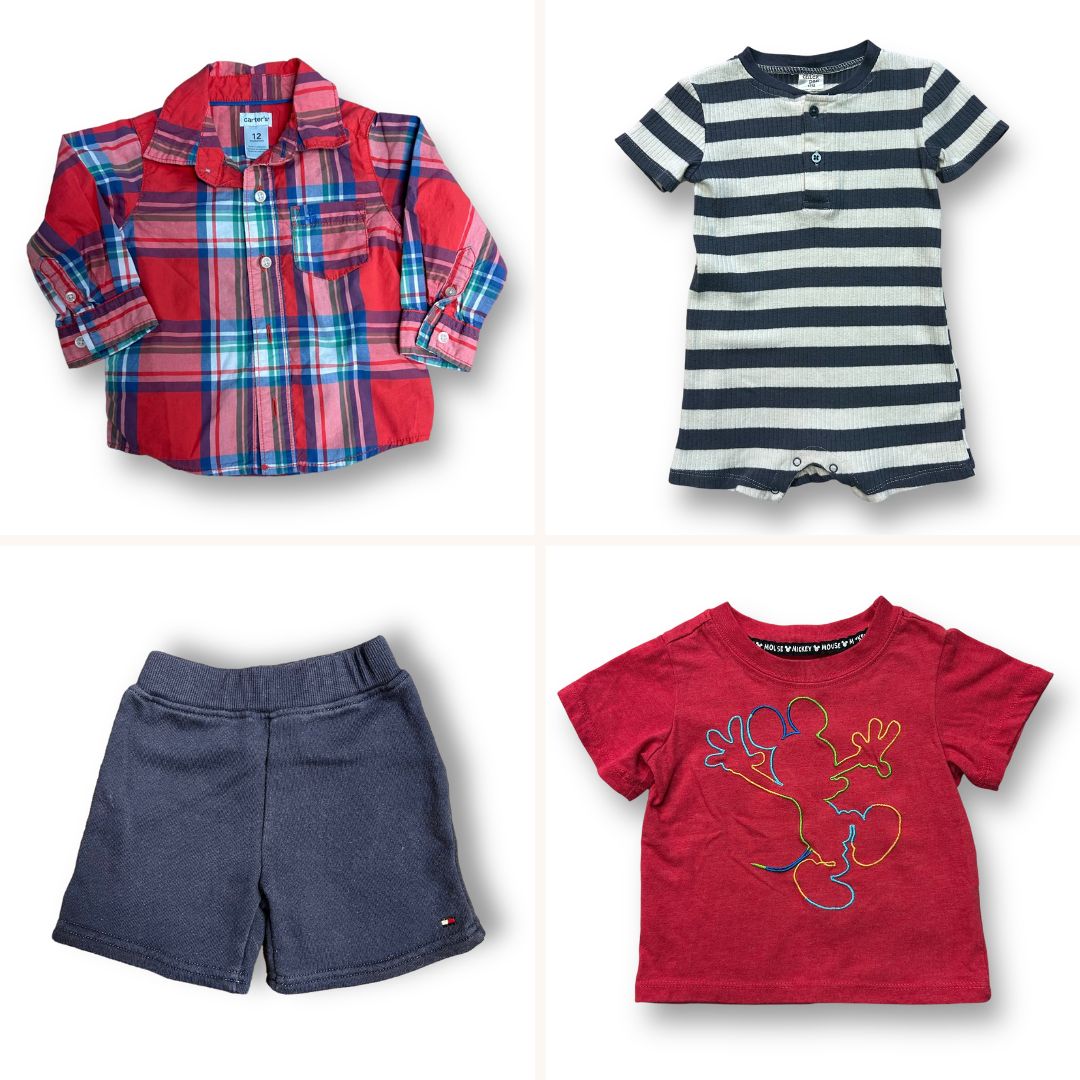 Boys Size 12 Months Romper, Shorts, Mickey Tee, and Button Down Shirt