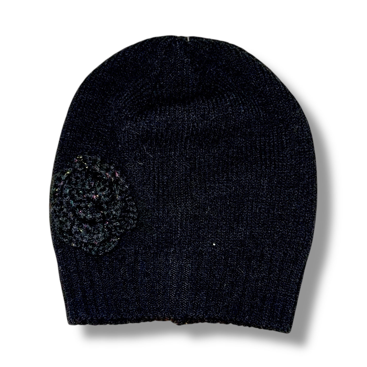 Toddler Girls Beanie Shimmery Black Knit Winter Hat with Flower Accent, One Size